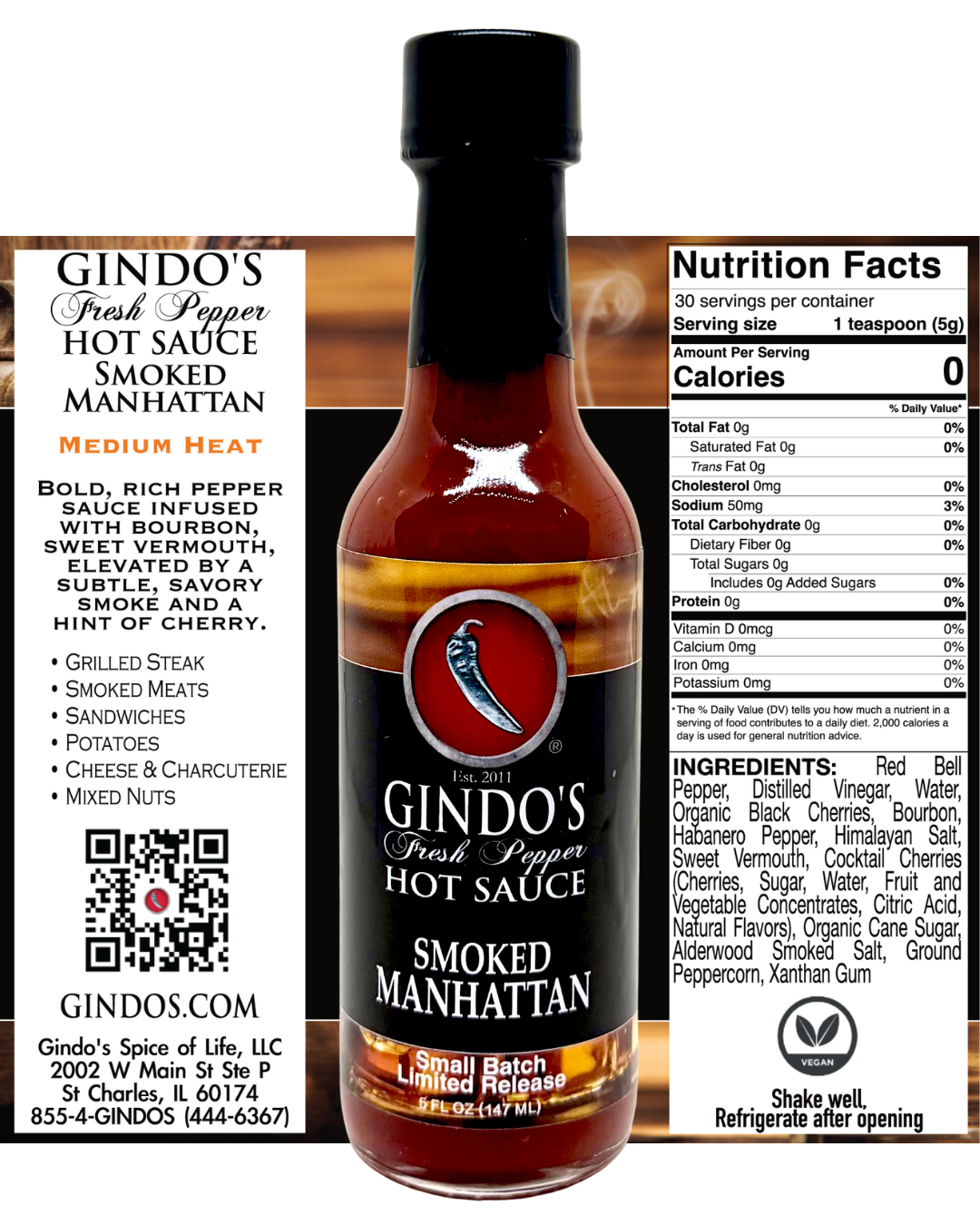 Gindo’s Smoked Manhattan Hot Sauce is a bold, cocktail-inspired creation that blends red bell pepper, organic black cherries, bourbon, habanero pepper, and sweet vermouth into a smoky, sweet-heat symphony worthy of any gourmet kitchen or craft cocktail lover. This small-batch sauce captures the essence of a classic Manhattan—complete with cocktail cherries, alderwood-smoked salt, and peppercorn—delivering layers of richness, warmth, and aromatic depth.