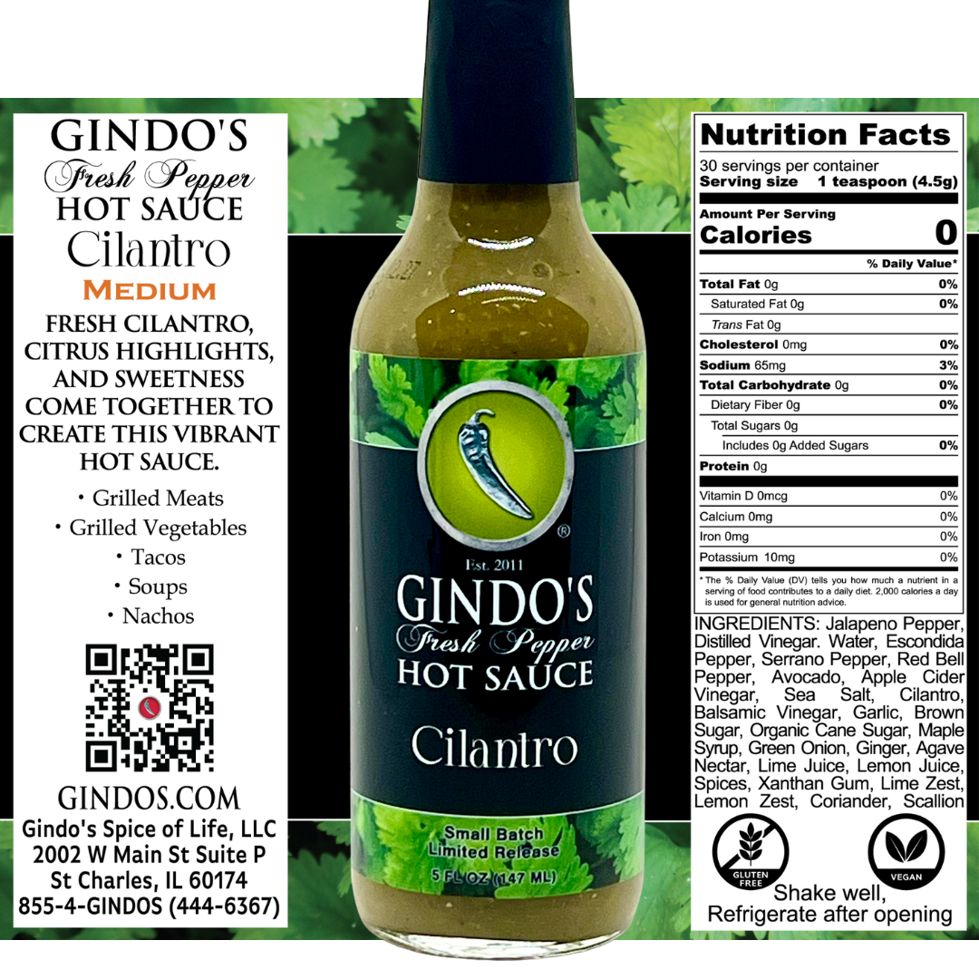 Gindo’s Cilantro Hot Sauce is a vibrant, herb-forward blend that brings garden-fresh flavor and bold heat to every bite. Crafted with jalapeño, serrano, and Escondida peppers, this sauce balances zesty cilantro, creamy avocado, and sweet notes of maple, agave, and balsamic vinegar. Bright citrus from lime and lemon juice enhances the fresh, tangy finish, while garlic, ginger, and green onion add depth and complexity. Perfect for tacos, grilled meats, seafood, roasted veggies, or even drizzled over avocado toast, this small-batch hot sauce delivers the ultimate balance of fresh herbs, lively peppers, and subtle sweetness.