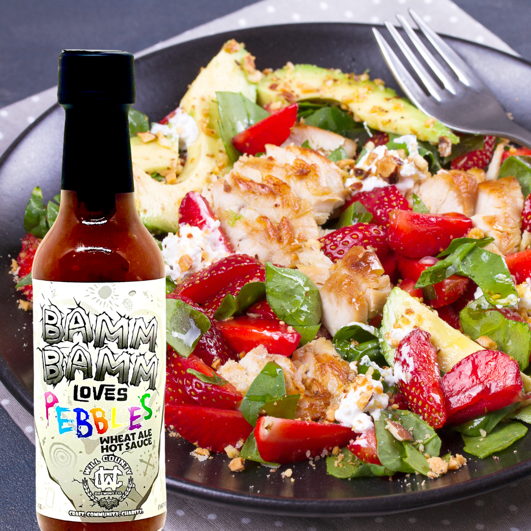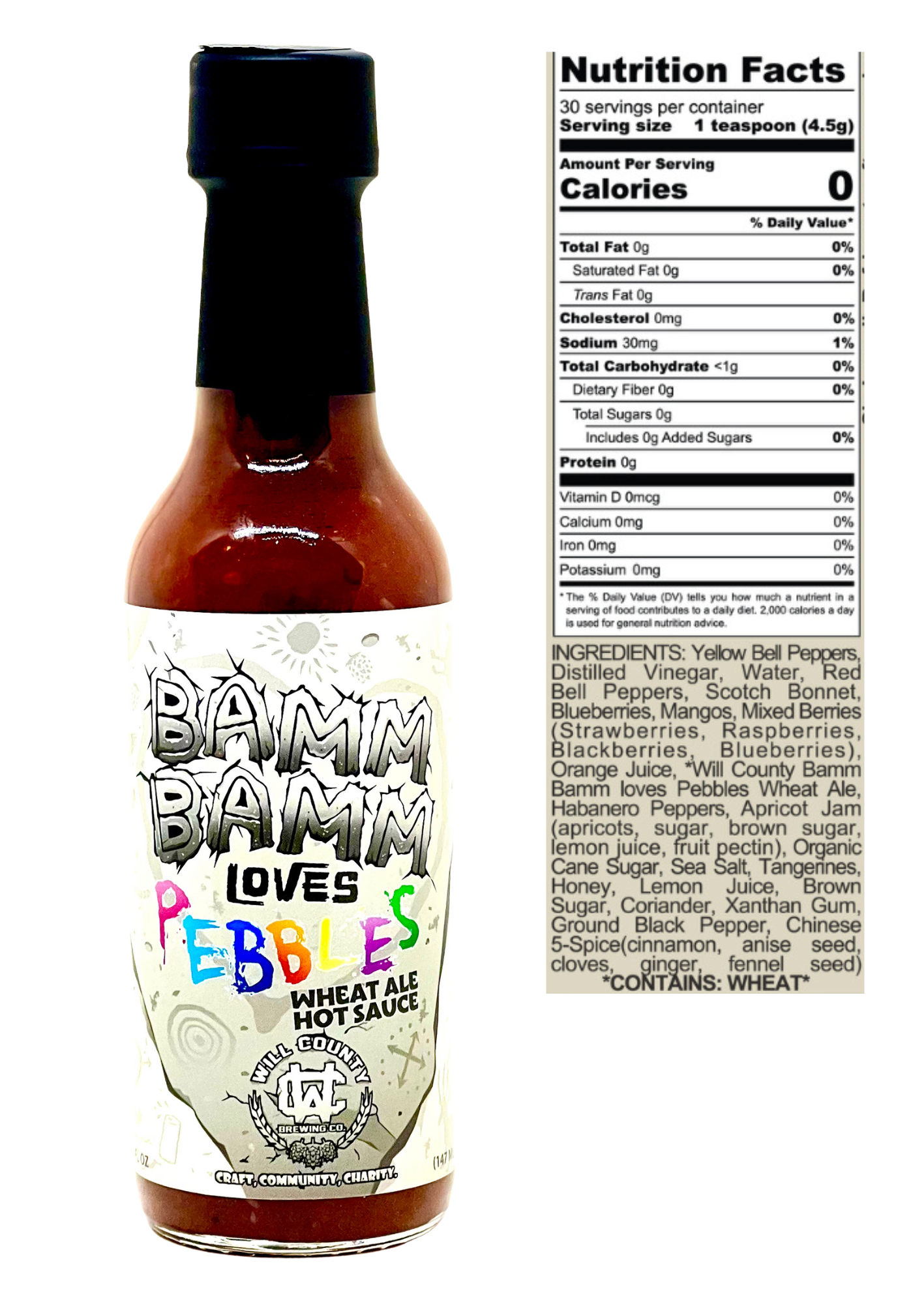 INGREDIENTS: Yellow Bell Peppers, Distilled Vinegar, Water, Red Bell Peppers, Scotch Bonnet, Blueberries, Mangos, Mixed Berries (Strawberries, Raspberries, Blackberries, Blueberries), Orange Juice, *Will County Bamm Bamm Loves Pebbles Wheat Ale, Habanero Peppers, Apricot Jam (Apricots, Sugar, Brown Sugar, Lemon Juice, Fruit Pectin), Organic Cane Sugar, Sea Salt, Tangerines, Honey, Lemon Juice Brown Sugar, Coriander, Xanthan Gum, Ground Black Pepper, Chinese 5-Spice (Cinnamon, Anise Seed, Cloves, Ginger, Fennel Seed) *CONTAINS: WHEAT