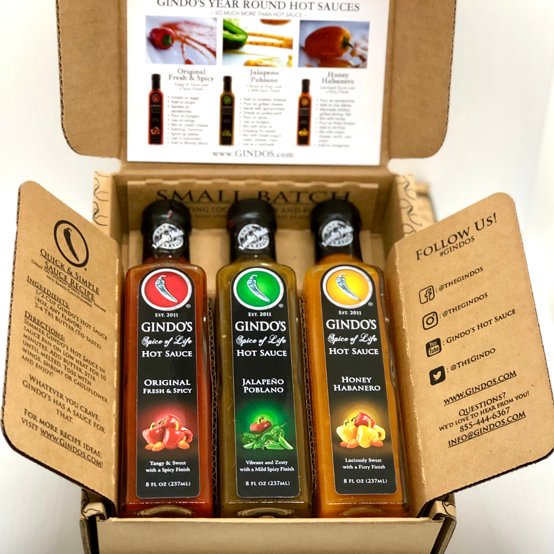 * Want to customize your gift box? Just add a note in the shopping cart saying which three Year-Round hot sauces you'd like (Example: 3 Bottles of Gindo's Original) and we'll create the box of your choosing! We can even add a special note for you. Let us know how we can make your gift more special!